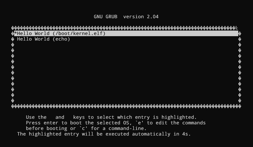Hello World (/boot/kernel.elf) 로 부팅을 하면 아래 화면이 나온다.